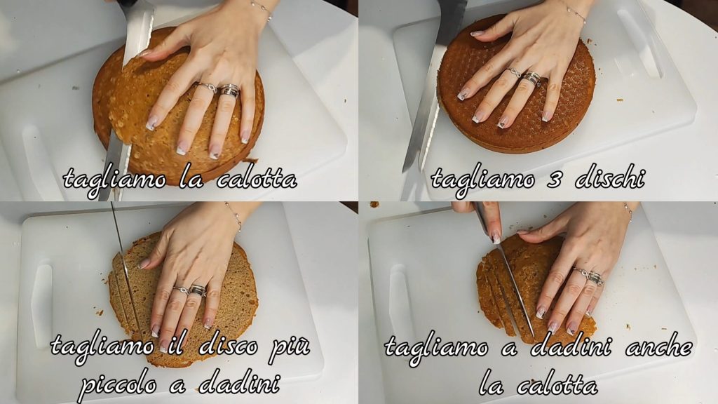 cut the top and level if needed, then cut into 3 discs. Cut the smallest disc into cubes. Also cut the top into cubes.