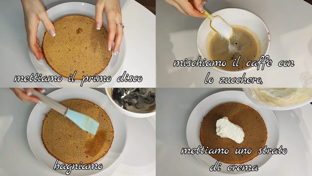 Place the first disc and soak with sweetened coffee. Add a layer of cream,