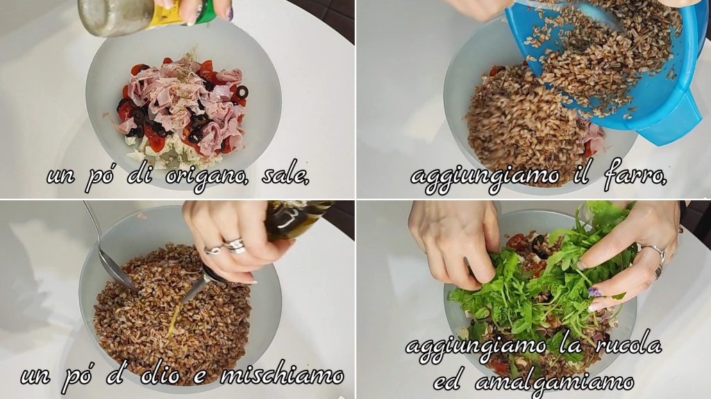 • Add some oregano, salt, the drained farro, olive oil, and mix everything well. Add the washed arugula and mix.