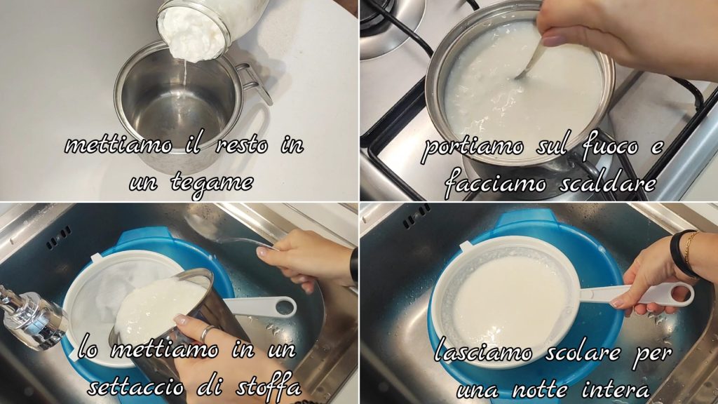 Put the rest in a saucepan. Heat it on the stove (the more you heat it, the harder the cheese will be; the less you heat it, the softer it will be). Let it drain in a cloth sieve overnight. The next day you can eat it!