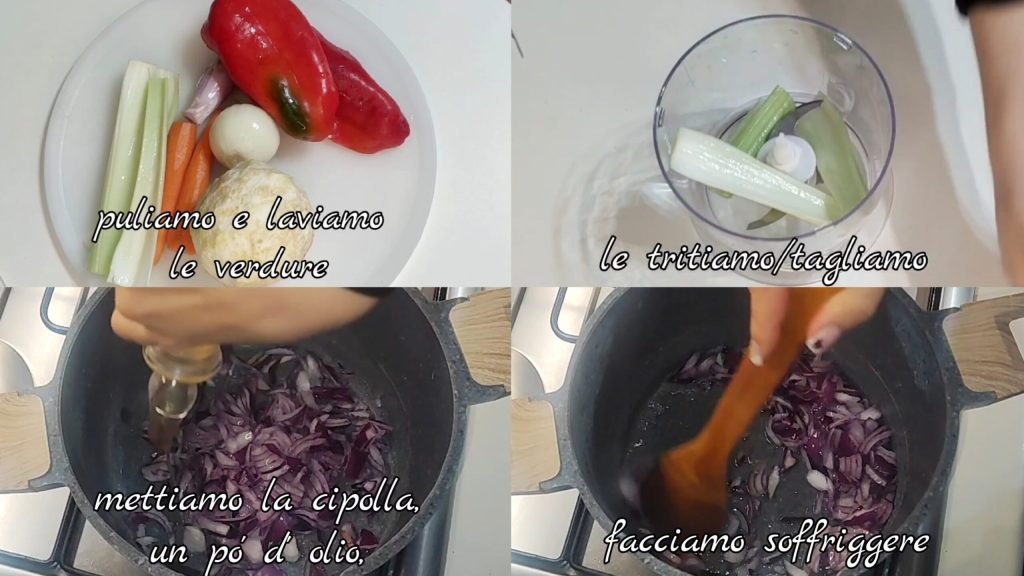 • First, we wash, clean, and cut (chop) the vegetables (I used the food processor to save time). In a saucepan, add some oil, the onion, and sauté.
