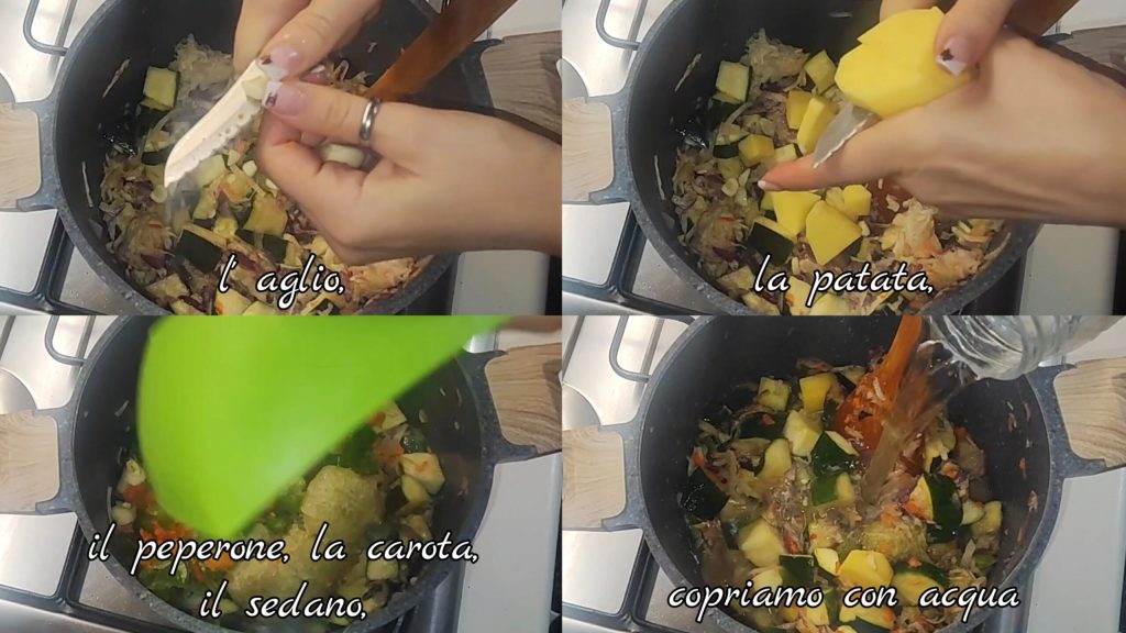 • Add the celeriac, garlic, potato, bell pepper, carrot, celery and cover with water.