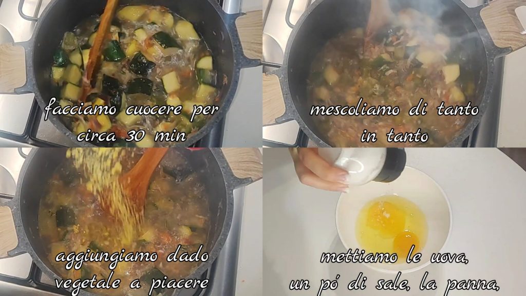 • Cook for about 30 minutes, stirring occasionally. Add vegetable stock cube to taste. In a bowl, add the eggs, a little salt, and the cream.