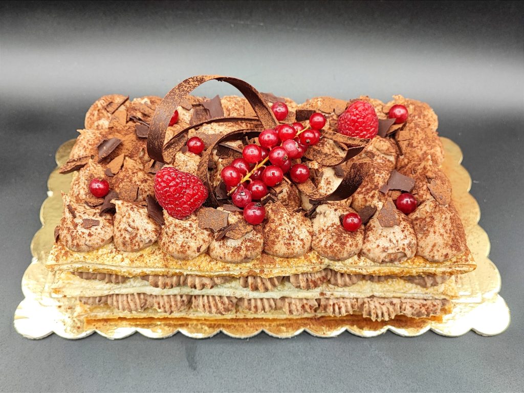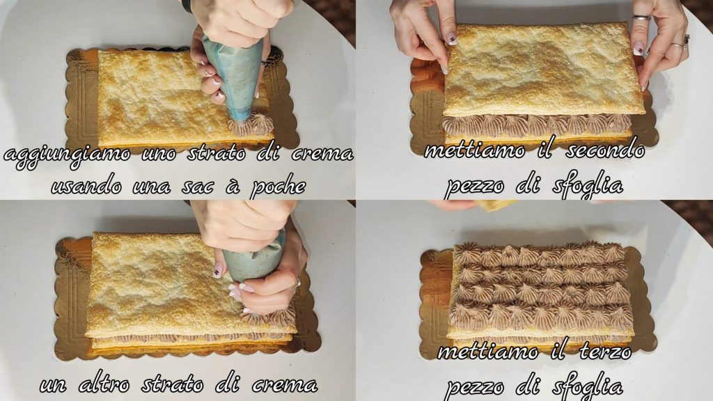 • Add a layer of cream using a piping bag. Add the second piece of pastry, another layer of cream, the third piece of pastry