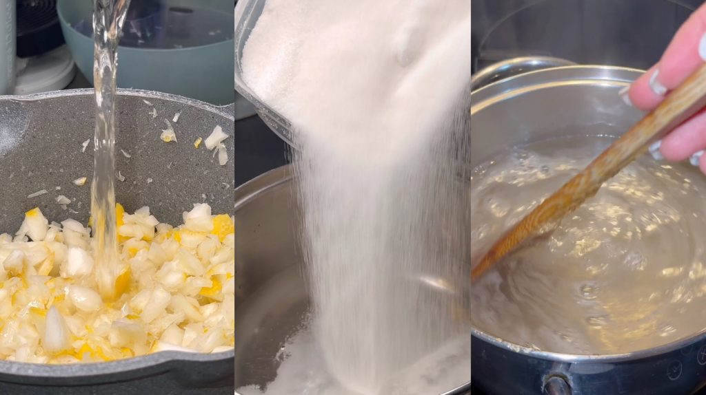 Add a glass of water and bring to the heat. In another small pot, put water and sugar and cook for a few minutes to obtain a light syrup.