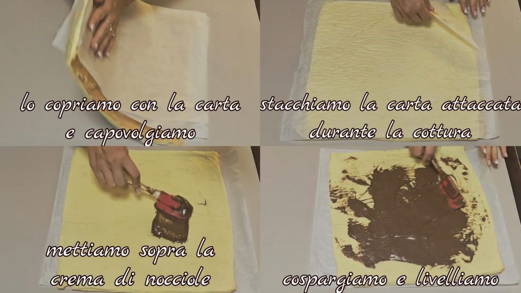 As soon as it comes out of the oven, cover it with another sheet of parchment paper, flip it over, and remove the attached parchment paper. Spread the hazelnut cream evenly over the surface.