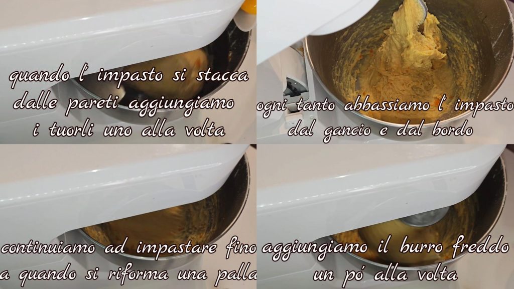 At this point, add the egg yolks one by one. Occasionally lower the dough from the hook and the sides. Continue to knead until a ball is formed again. Add the cold butter a little at a time and continue to knead until the dough is sufficiently elastic (watch the video HERE).