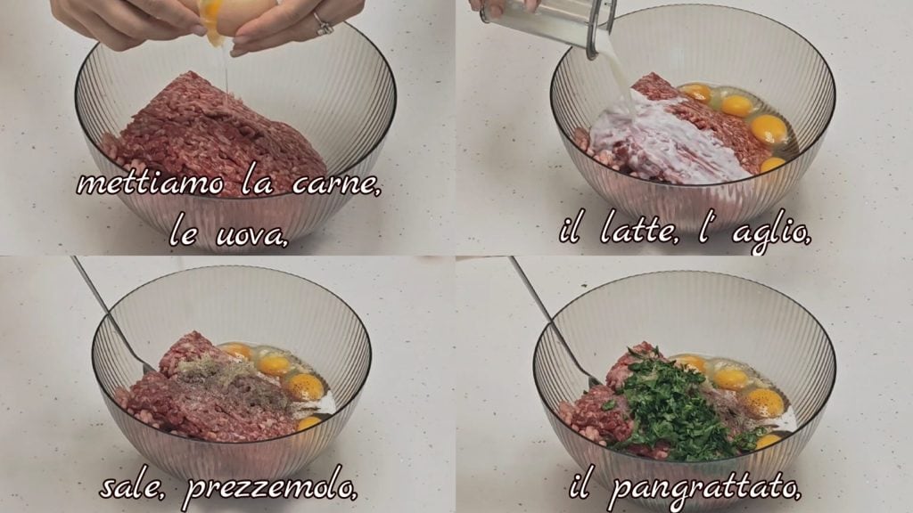 In a bowl, put the meat, eggs, milk, garlic, salt, chopped parsley, breadcrumbs,