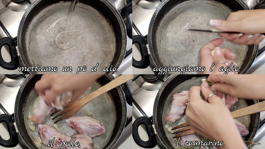 In a pan, put some oil, garlic, the chicken, rosemary.