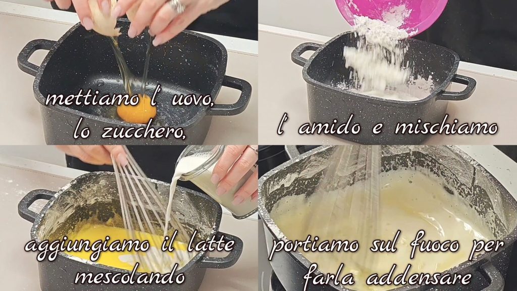 In a saucepan, place the egg, sugar, and cornstarch and mix. Add the milk while stirring. Bring to a boil to thicken,
