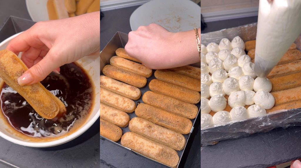 Arrange a first layer of ladyfingers soaked in sweetened coffee on the bottom.