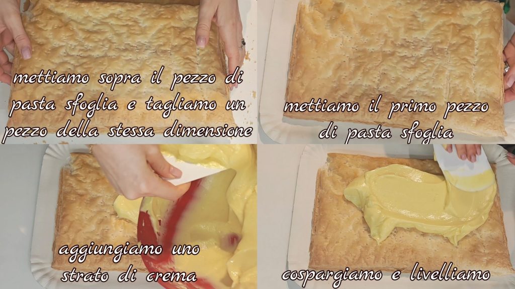 Place the first piece of puff pastry and cover it with a layer of custard, cover the entire pastry, and level.