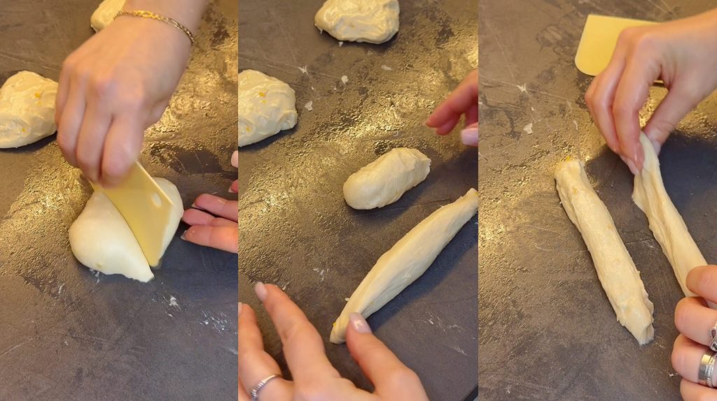 Form a ball and divide the dough into pieces of about 100 g each (≈3.5 oz).