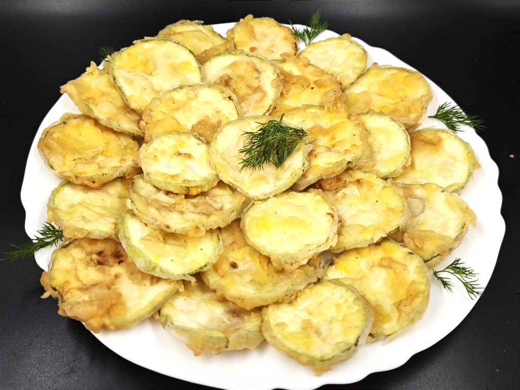 In a bowl, place the eggs, spices to taste, and beat them. Slice the cleaned and washed zucchini thinly using a mandoline. Coat the slices first in the egg and then in the flour.