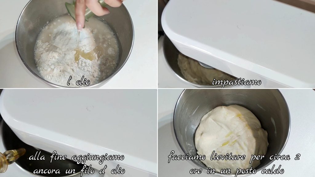Knead using the mixer or by hand. Finally, add a little more oil. Let rise for about 2 hours in a warm place.