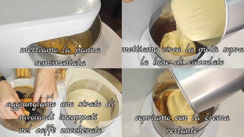 Add the semi-whipped cream. Whip for a few minutes until you get a thick and homogeneous cream. Place about half of the cream obtained over the hardened base. Add a layer of coffee-soaked ladyfingers and cover with the remaining cream.