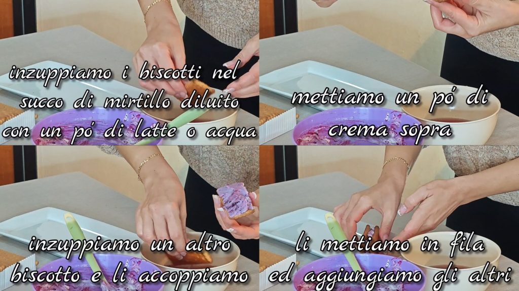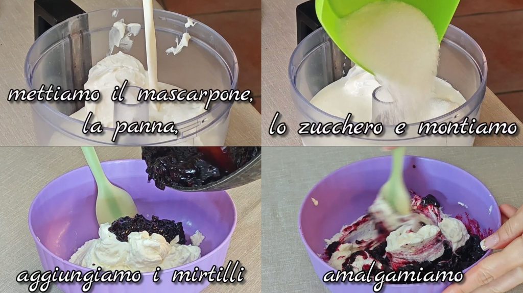 The cream made from mascarpone and whipped cream is enriched with a delicious blueberry sauce that gives a fruity and slightly tart flavor. Cookies soaked in blueberry juice create a soft and delicate texture, while chopped hazelnuts add a crunchy note.