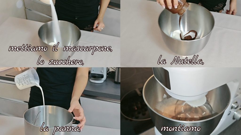 First, prepare the cream: Put the mascarpone, sugar, Nutella, cream and whisk until you get a thick and homogeneous cream.