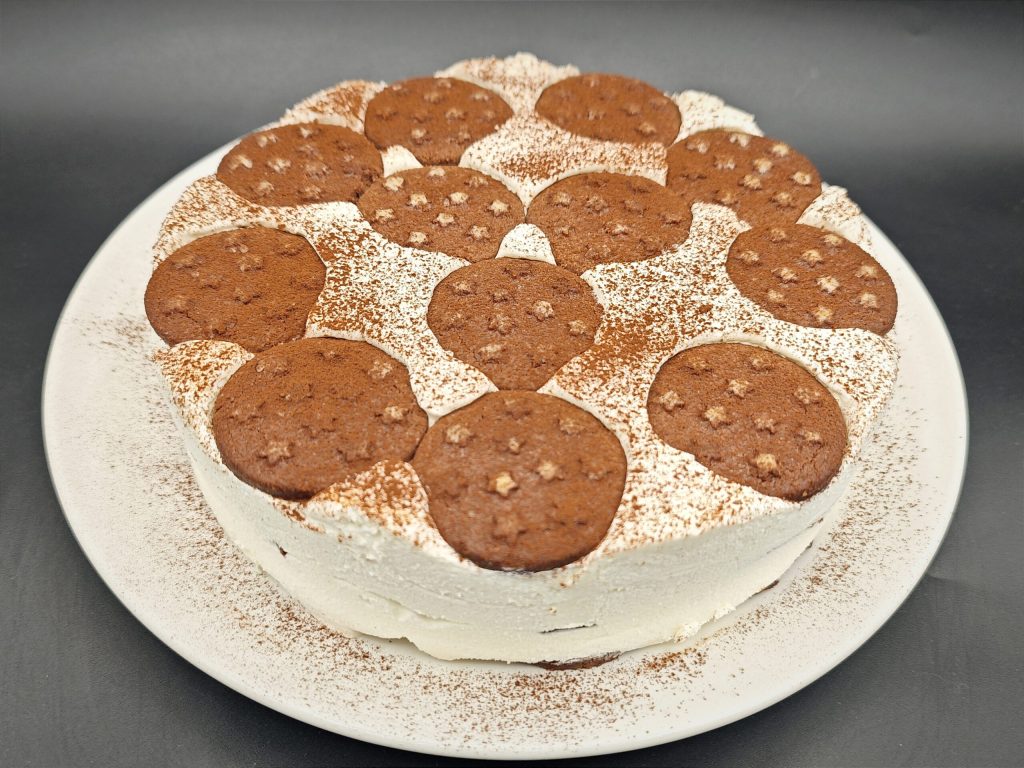 • Place a layer of cookies upside down on the bottom of the mold. (I recommend using a silicone mold, otherwise cover it with cling film to make it easier to remove the cake). Add a layer of cream (about half), place pieces of chocolate and some crushed cookies. Cover with the remaining cream (about half)