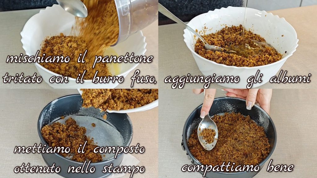 Mix the chopped panettone with the melted butter, add the egg whites and mix well. Place the obtained mixture in the mold lined with parchment paper and compact well.