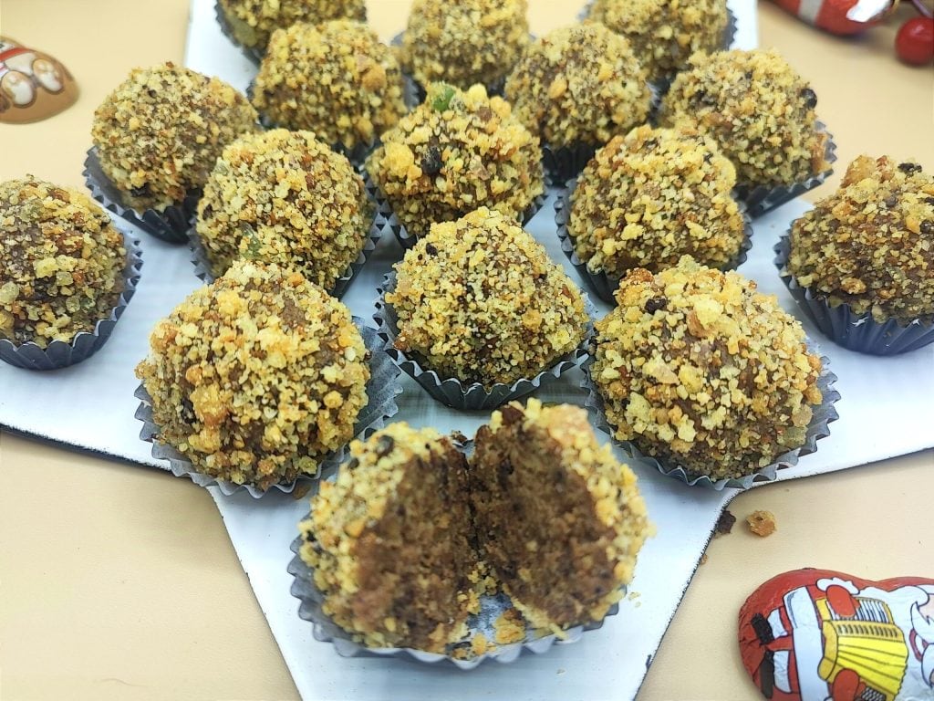 Take a little bit of the mixture at a time and shape it into balls with your hands. Roll the formed balls in the crumbled panettone and then place them onto paper cups. Continue until the mixture is used up.