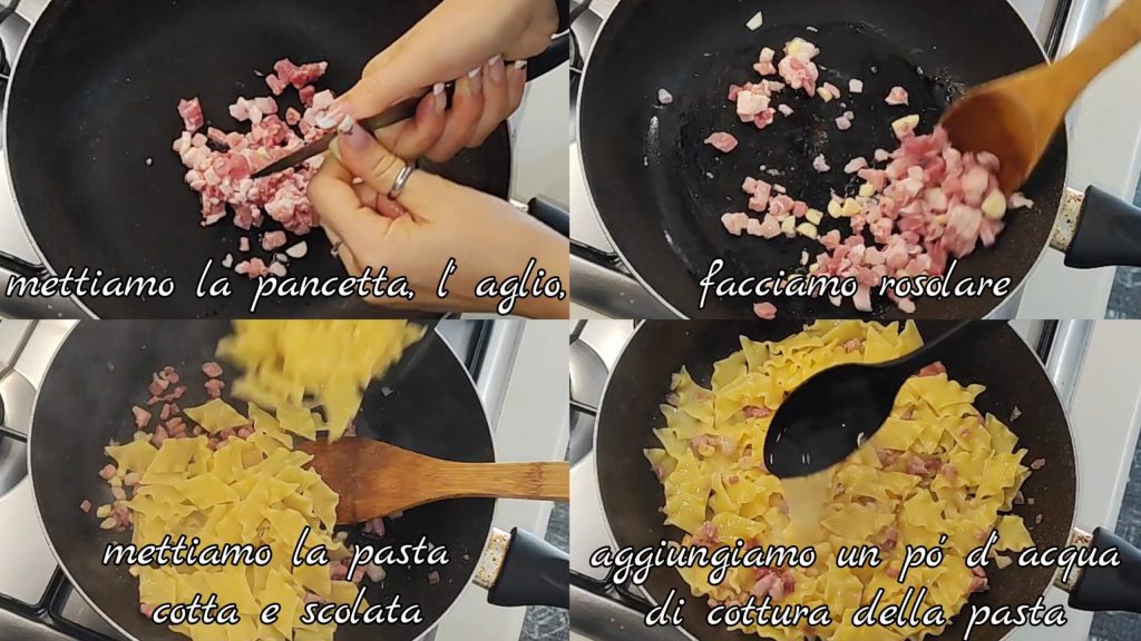 In a pan, place the bacon and garlic and let them brown. Meanwhile, cook the pasta to your liking and add it drained. Add a bit of the pasta cooking water,