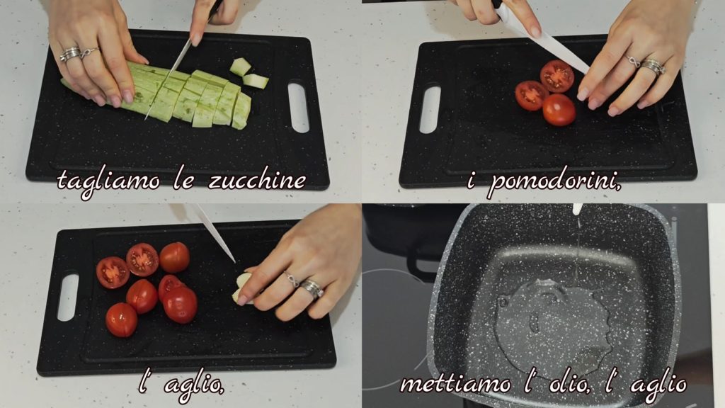 • First, wash, clean, and cut the zucchini, cherry tomatoes, and garlic. In a pan, add some oil and garlic.