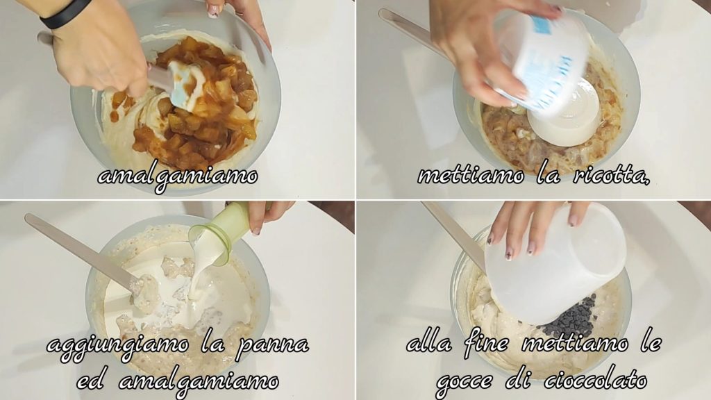 Mix well. Add the ricotta and mix. Add the cream and mix everything well. Finally, add the chocolate chips.