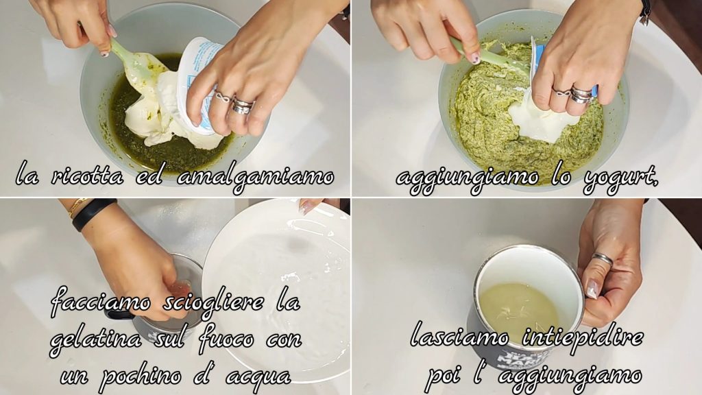 • Add the ricotta and mix. Add the yogurt and mix. Melt the gelatin on the stove with a little water, let it cool slightly then add it.