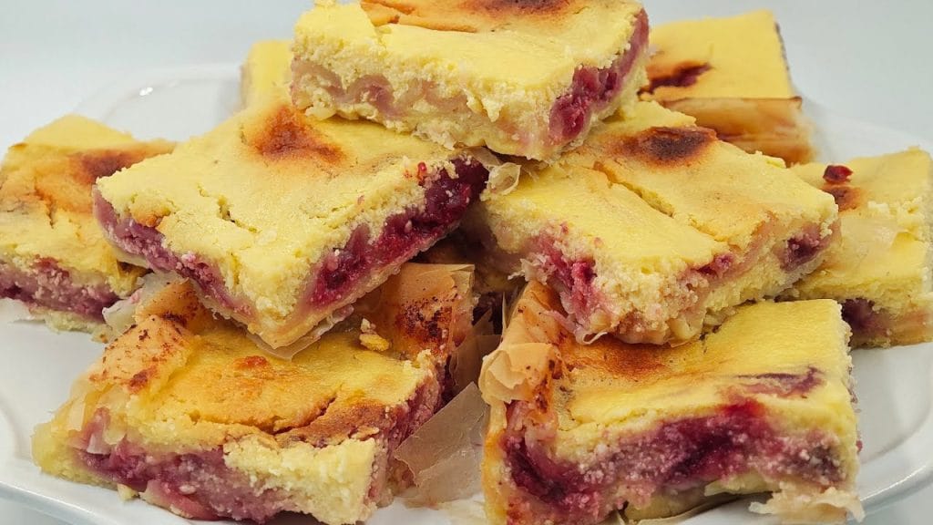 This delicious cake of phyllo dough with ricotta and sour cherries is a traditional-inspired dessert, perfect for those who love contrasts between the creamy sweetness of ricotta and the slightly tart note of sour cherries. A crunchy phyllo dough shell encloses a soft and fragrant filling, ideal to serve at the end of a meal or for a special snack. The preparation is simple but impressive: extremely thin layers of phyllo dough are brushed with melted butter, filled with a sweetened ricotta cream, and enriched with a generous layer of sour cherry jam (or compote). The result is a light and refined dessert, with a balanced and irresistible taste. Perfect also to prepare in advance, this cake wins over at the first bite with its flaky texture and soft, fruity heart. Try it and be surprised by the goodness of a simple yet rich traditional dessert!