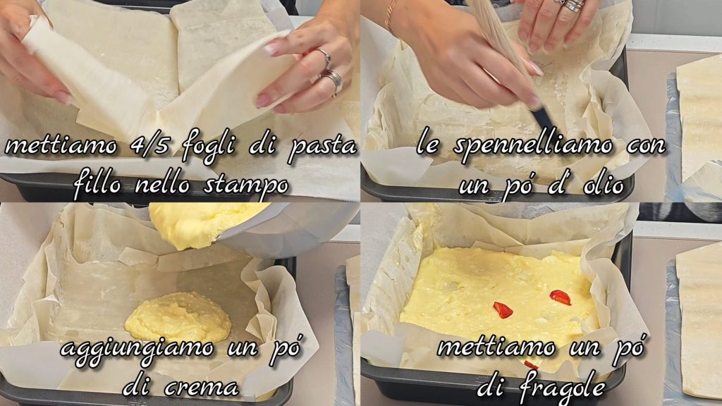 • Place 4/5 sheets of phyllo dough at the bottom of the pan and brush with a bit of oil. Add some cream and chopped strawberries.