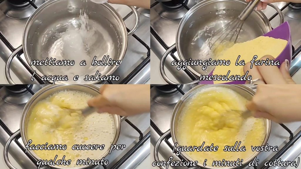 In a saucepan, bring the water to a boil, salt it, then when it boils add the cornmeal, stirring with a whisk to prevent lumps. Cook for a few minutes (check the exact minutes on your package).