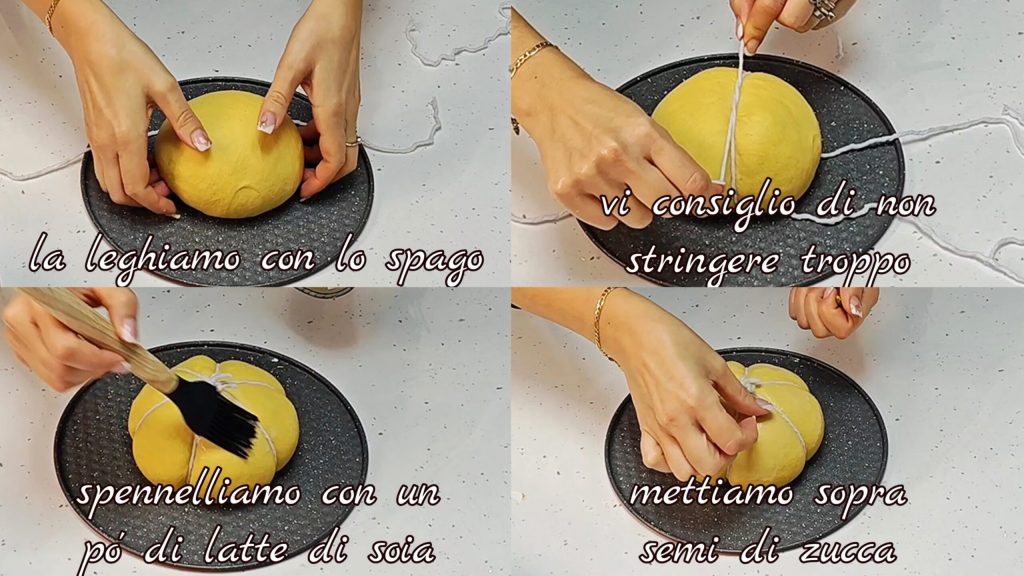 Tie it with the string. I recommend not tightening the string too much. Brush the surface with a little water or milk (I used soy milk) and sprinkle some pumpkin seeds on top.