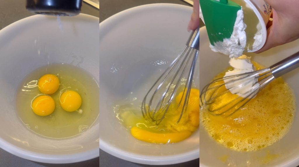 First, crack the eggs into a bowl, add a pinch of salt and whisk them.