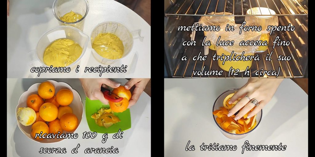 Cover them and let them rise in the oven with the light on until they triple in volume (it will take about 12 hours). In the meantime, remove the zest from the oranges to get 3.53 oz of zest and chop it finely.