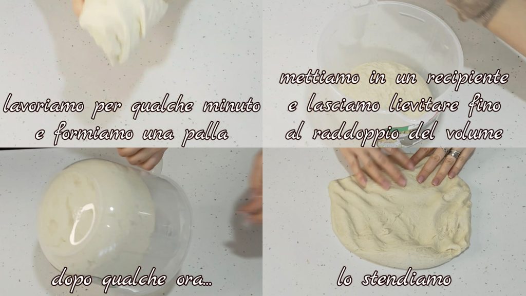 We put the flour, crumbled yeast, oil, a pinch of salt, water, and knead. When the dough detaches from the walls, we transfer it to the work surface.