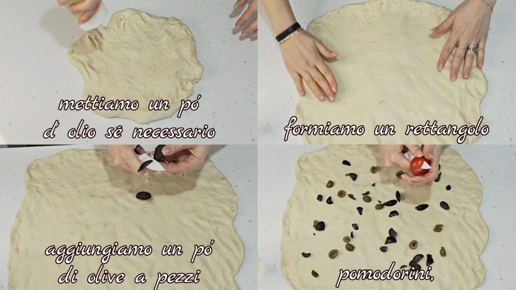 add a little oil if needed and form a rectangle. We add some chopped olives, cherry tomatoes
