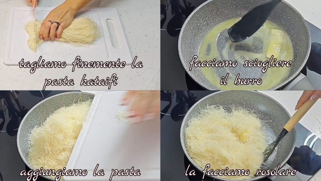 In a pan, melt the butter and add the kataifi pastry, lightly browning it.