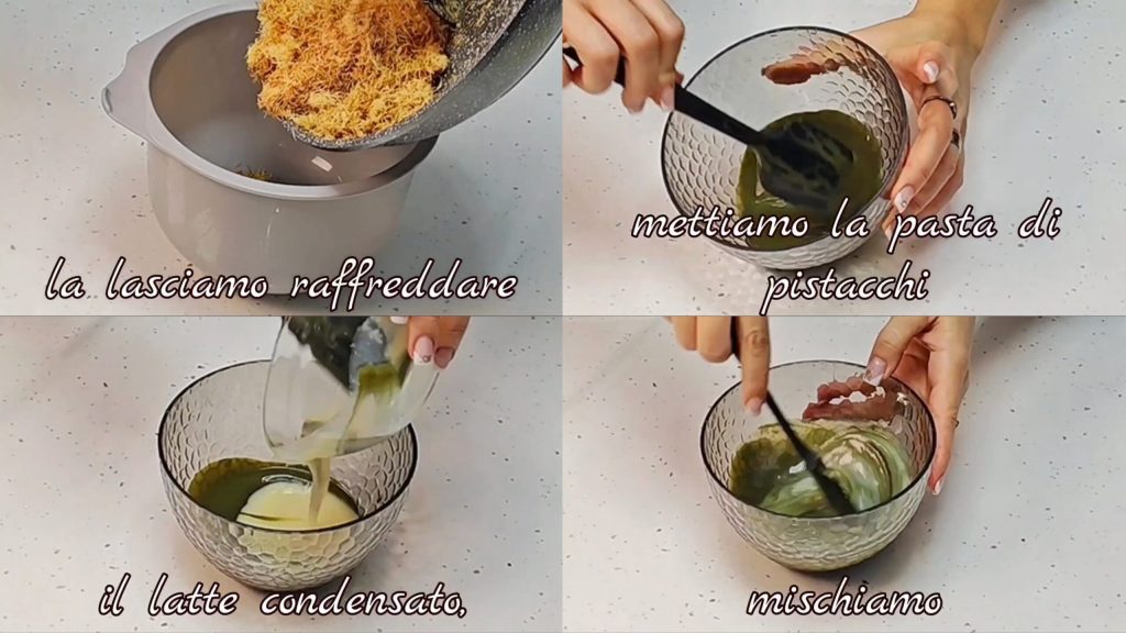 Combine the cooled mixture with the kataifi pastry and mix well, obtaining a uniform and creamy filling.
