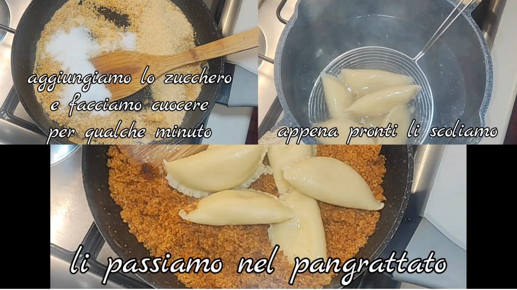 Add the sugar and cook for another 1/2 min. Once they are ready, drain them and coat them in the breadcrumbs.