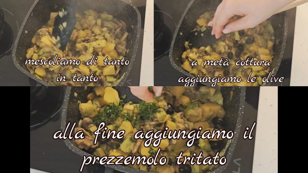 Halfway through cooking, add the olives. At the end, add freshly chopped parsley.