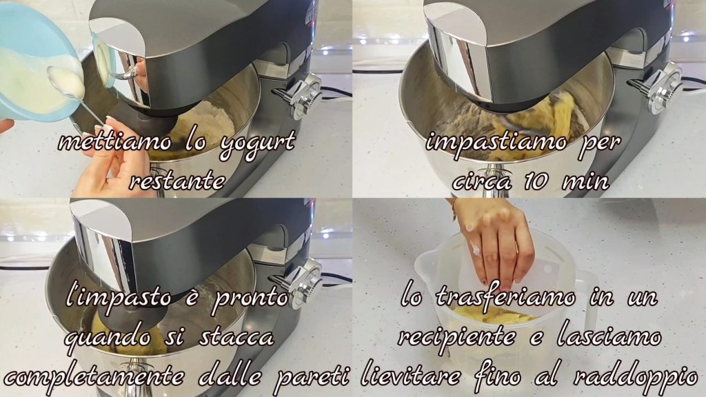 • Add the remaining yogurt and knead for about 10 minutes. The dough is ready when it completely detaches from the sides. Transfer it to a container and let it rise until it doubles in volume.