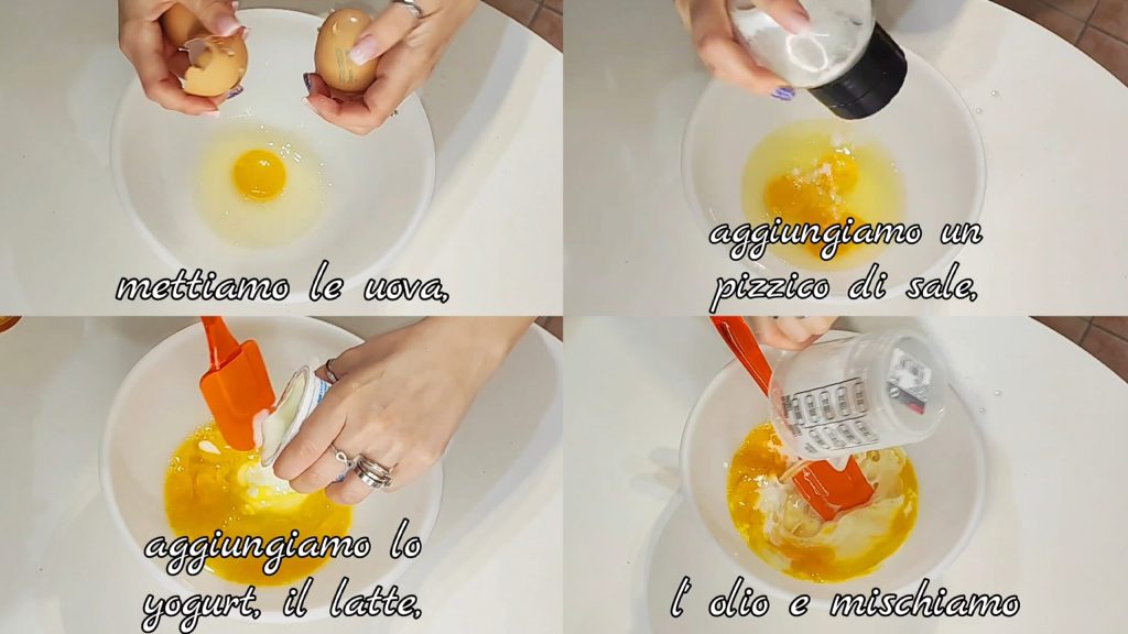 • In a bowl, put the eggs, a pinch of salt, and mix. Add the yogurt, milk, oil, and blend.