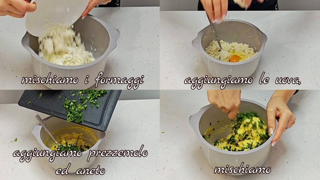 Mix the cheeses then add the eggs, dill, and chopped parsley,