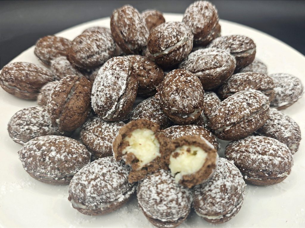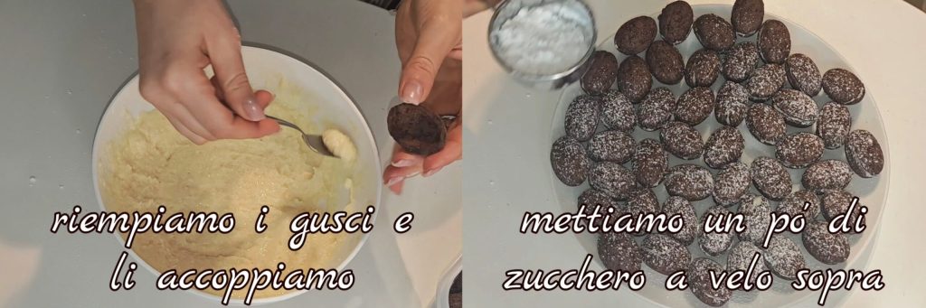 Fill the shells and pair them. Sprinkle a little powdered sugar on top.