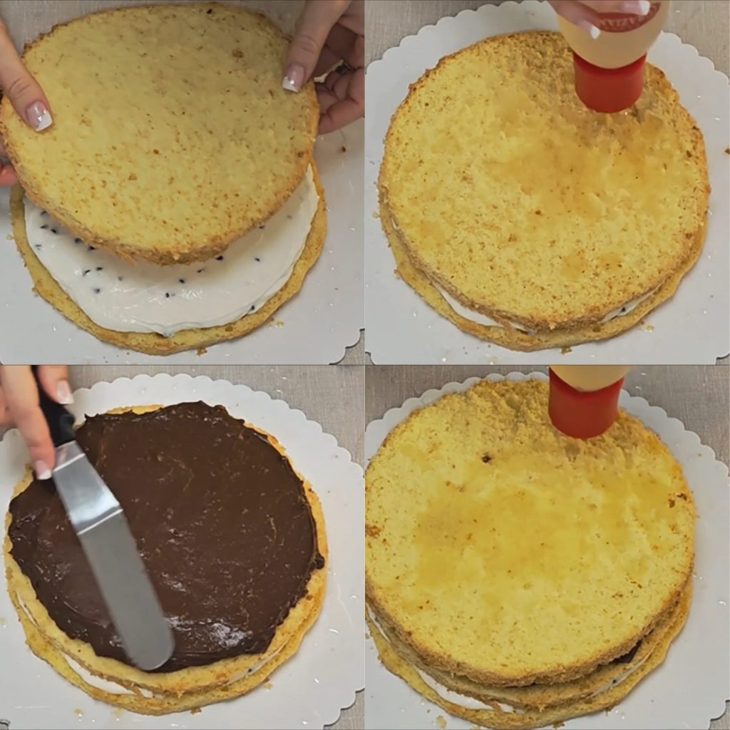 add a layer of ricotta cream, the second sponge cake disc, and dampen it. Add a layer of chocolate cream and cover with the third disc. Dampen it and clean the edge if necessary.