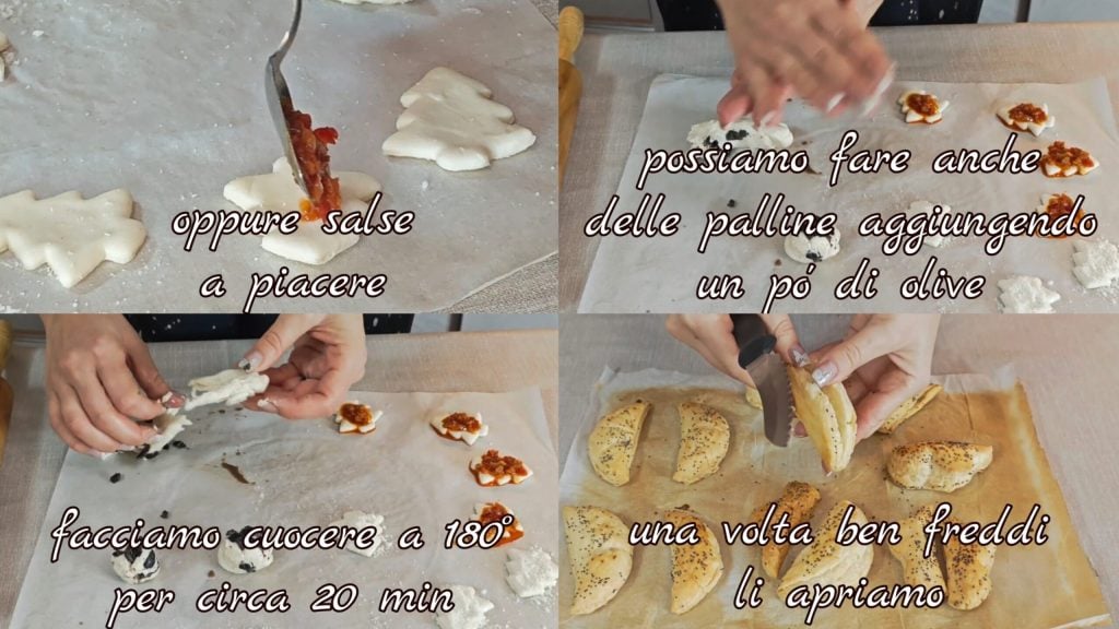 If desired, you can add sauces to taste. With the remaining dough, you can make small balls by adding a bit of olives. Bake at 350°F for about 20 minutes. Once well cooled, open them.
