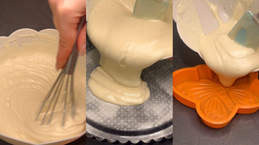 Reserve a little batter and bake it in a small pan: we’ll use it for the mimosa cubes.