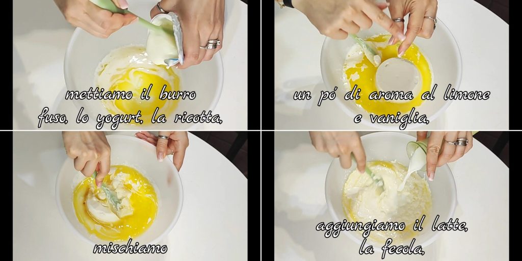 In a bowl, put melted butter, yogurt, ricotta, lemon flavor, and vanilla, then mix. Add the milk, potato starch.