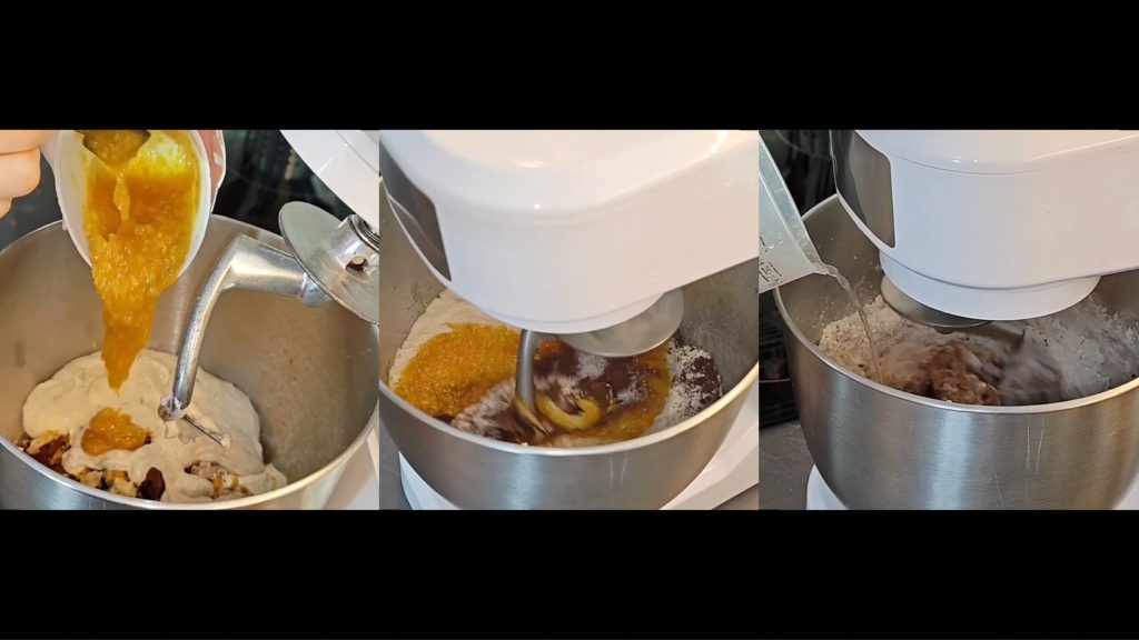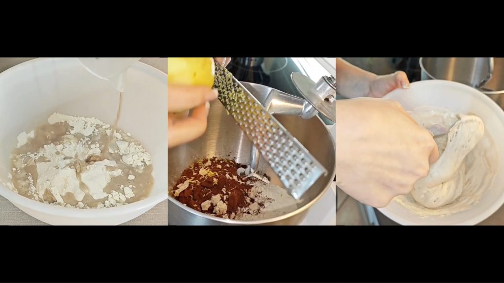 Add the orange paste and lemon zest. Gradually add cold water and knead until you get a stretchy and soft dough (about 10min).